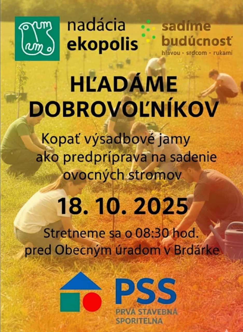 02.10.2025 09:17V sobotu 18.10.2025 sa uskutoční obecná brigáda pri úprave terénu a kopaní jám pre ovocné stromy. Náš projekt Alej žvota cez výzvu Sadíme budúcnosť Nadácie Ekopolis v spolupráci s Prvou stavebno sporiteľnou, a.s, počíta s vysadením 50 kusov ovocných stromčekov popri obecnej poľnej ceste smerom z križovatky pri tabuli o ovocinárstve smerom do Kobeliarova.